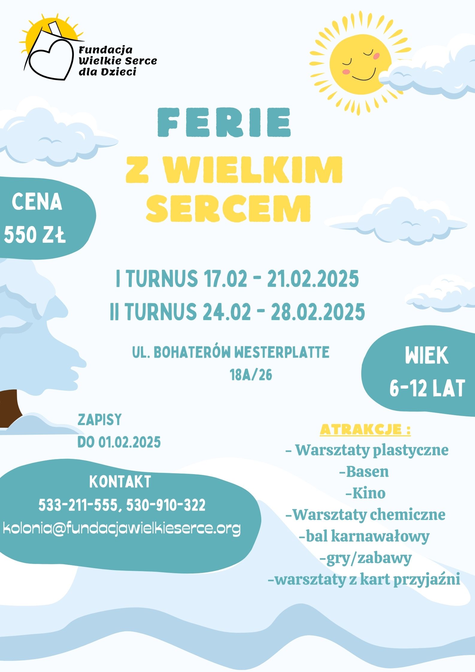 Serdecznie zapraszamy do zapisów na ferie zimowe w Krośnie z WIELKIM SERCEM! Jest nam niezmiernie miło, że możemy po raz kolejny organizować dla Państwa dzieci wypoczynek. W zimowe ferie czeka na Państwa dzieci moc atrakcji, kreatywne zajęcia i duża ilość świetnej zabawy.SZCZEGÓŁY