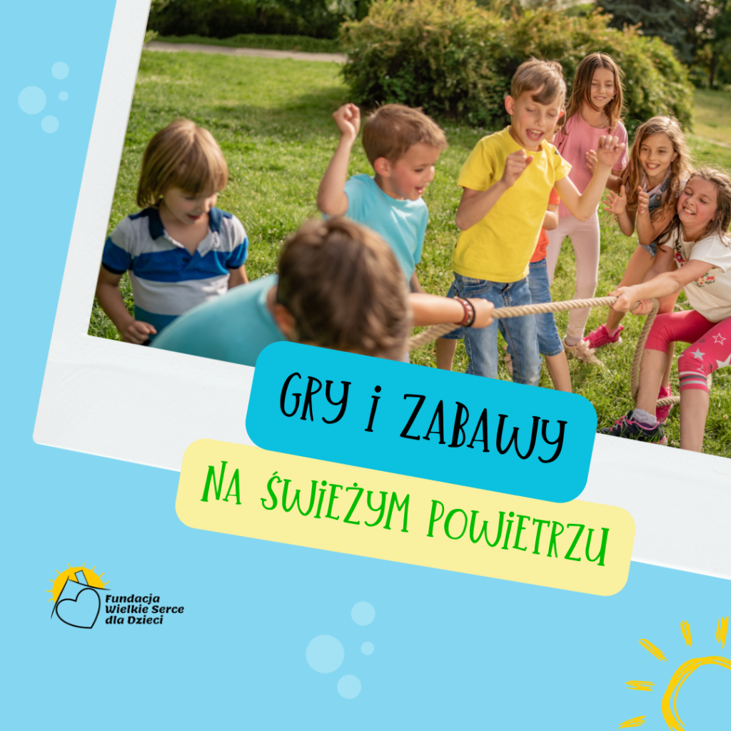 - Zabawy na świeżym powietrzu (wyścigi skoków w workach, biegi w spodniach XXL, przeciąganie liny, skakanie przez gumę, rzut kaloszem w dal, kapsle, Baba Jaga patrzy, gra w szczura, zabawy integracyjne z chustą, podchody, turnieje i gry sportowe, marsz na orientację).