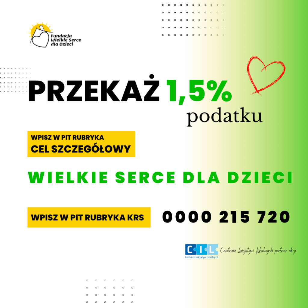 Jeśli wpiszesz prawidłowy KRS 0000 215 720 i cel szczegółowy: Wielkie Serce dla Dzieci twój 1,5% podatku trafi na konto naszej fundacji.