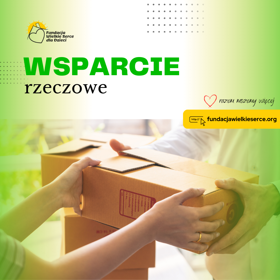 W ramach naszych działań organizujemy zbiórki, wsparcie rzeczowe dla dzieci i rodzin. Podopieczni Fundacji Wielkie Serce dla Dzieci to osoby z różnymi potrzebami. Jeśli chcą Państwo przekazać wsparcie rzeczowe dla naszych podopiecznych – zapraszamy do indywidualnego kontaktu. Nasi specjaliści udzielą informacji na temat aktualnych potrzeb.